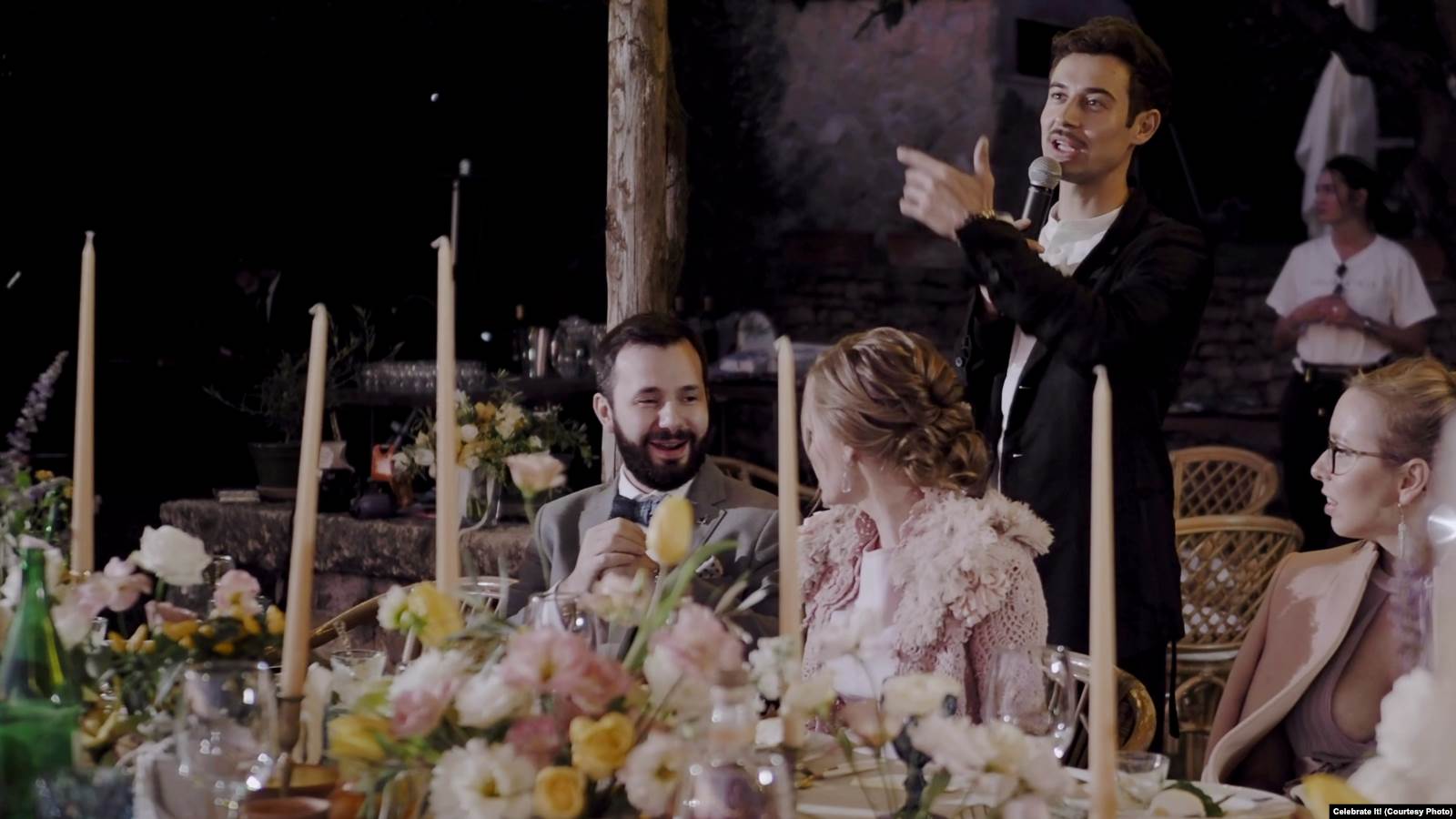 На нескольких кадрах видно, что этой ночью Воронцова танцевала с невысоким бородатым мужчиной в бабочке. Друг жениха и невесты, на свадьбе он участвовал в конкурсах – вышел к гостям вместе с тремя другими мужчинами в разрезанной на лоскуты сорочке (якобы, такие рубашки проще гладить их женам).