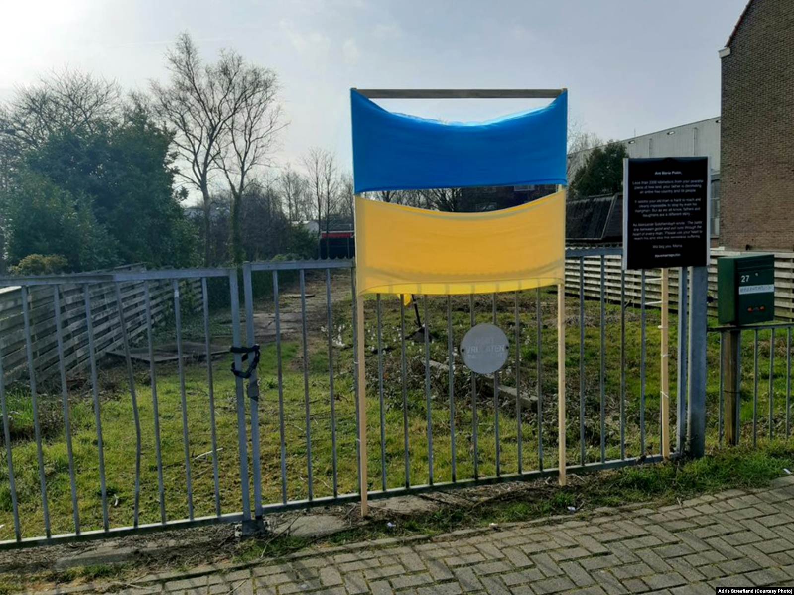 В начале марта 2022 года неизвестные установили перед забором пустующего участка площадью в два теннисных корта в пригороде Амстердама Дювендрехте украинский флаг. Еще один флаг появился прямо на участке. А на почтовый ящик у калитки прилепили наклейку с хэштегом "#AveMariaPutin" ("Приветствуем, Мария Путина").