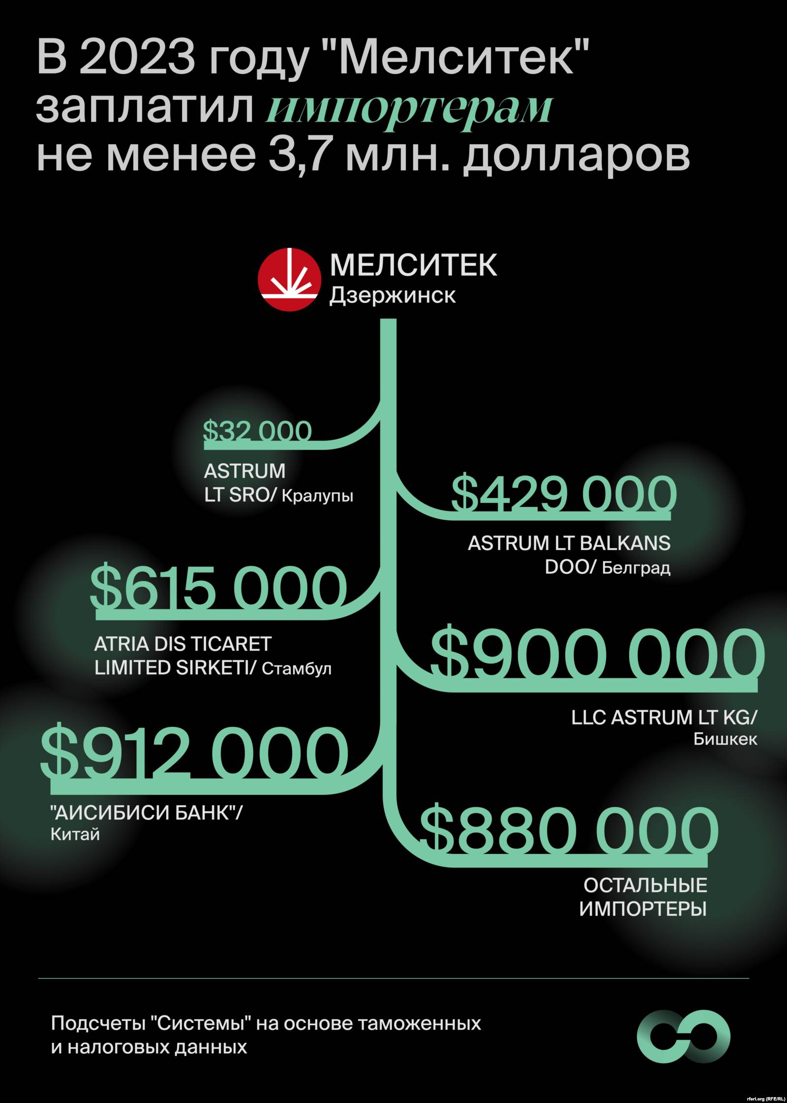 Эти компании выступают формальными покупателями компонентов производства у поставщиков по всему миру. При этом, согласно таможенным данным, изученным "Системой", продукция не едет ни в Бишкек или Стамбул, а отправляется напрямую в Россию, в "Мелситек".