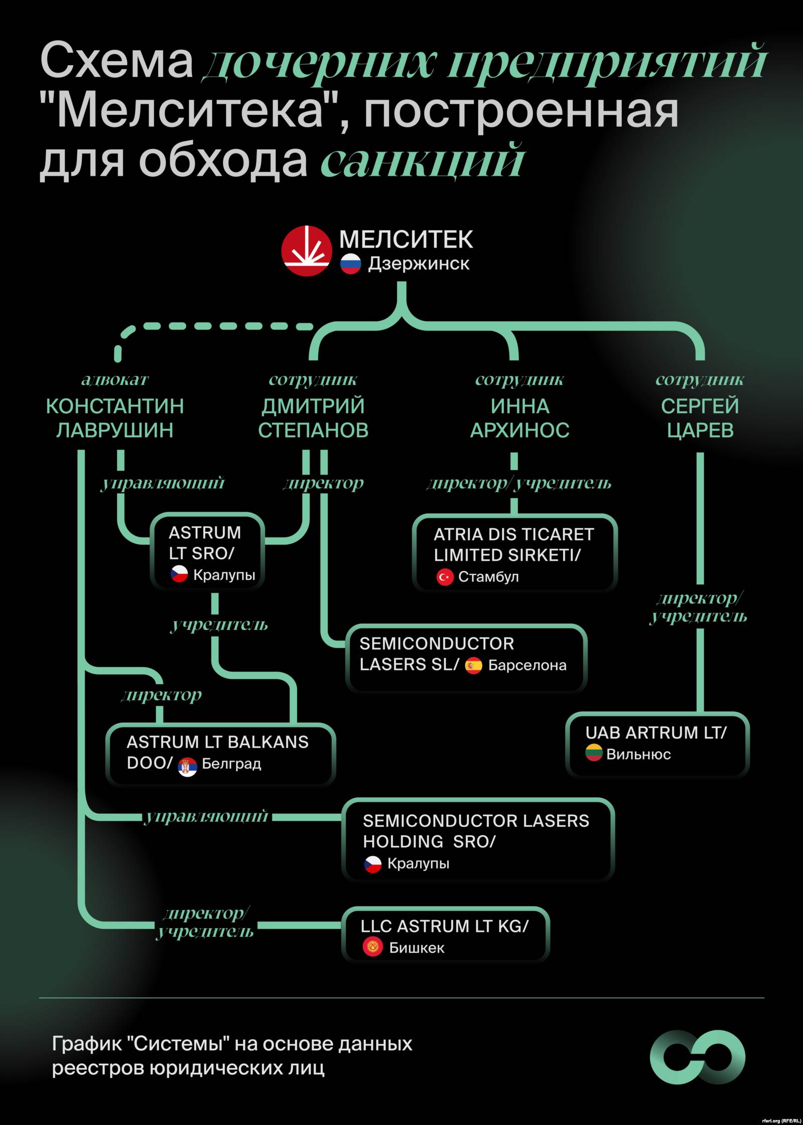 С 2022 года юрист Лаврушин начал создавать целую сеть компаний в Белграде, Бишкеке и Стамбуле. Выбор Сербии, Кыргызстана и Турции для ведения бизнеса не случаен: эти страны не вводили ограничения на поставку товаров в Россию. Компании в Белграде и Бишкеке чешский юрист оформил на себя, в Стамбуле же директором числится Инна Архинос – сотрудница российской компании. Есть и литовская участница "сети Мелситека", ею руководит Сергей Царев – еще один сотрудник российской компании. Судя по утечкам из российских баз данных, Царев стабильно получает на свое российское ИП зарплату от "Мелситека".